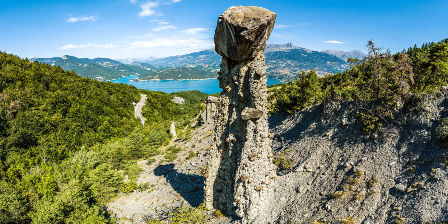Vom Campingplatz Sunêlia La Presqu'île aus sichtbar, können Sie durch die umliegende Landschaft diese Feenkamine beobachten, die gemeinhin als Damenkäppchen bezeichnet werden.