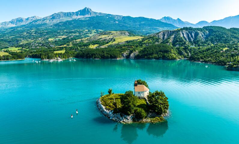 Der Lac de Serre-Ponçon liegt im Herzen der Hautes-Alpes und ist ein touristisches Gebiet, das reich an Geschichte ist und eine Vielzahl von Outdoor-Aktivitäten bietet.