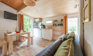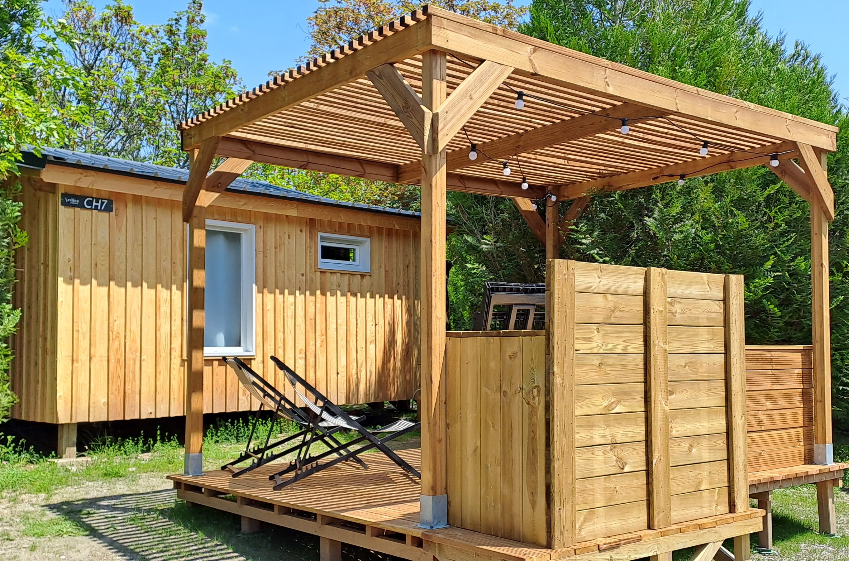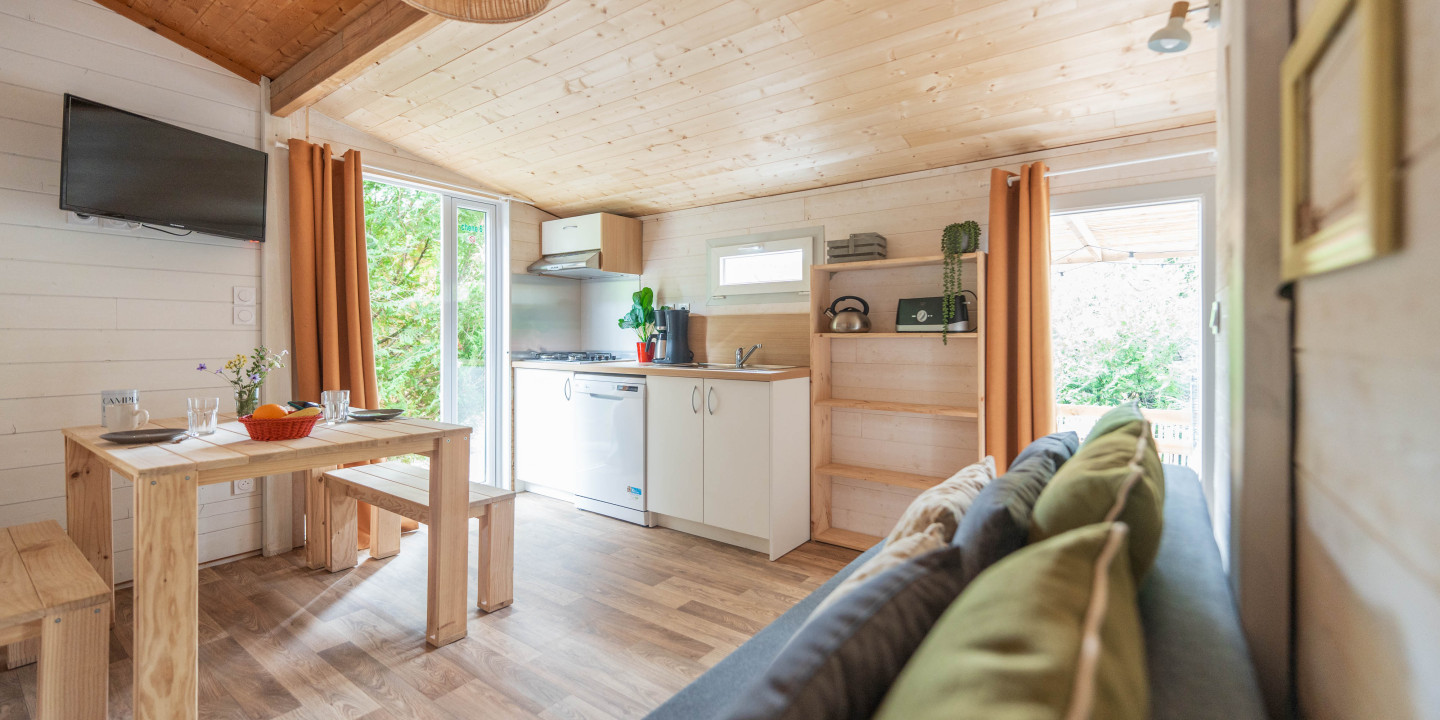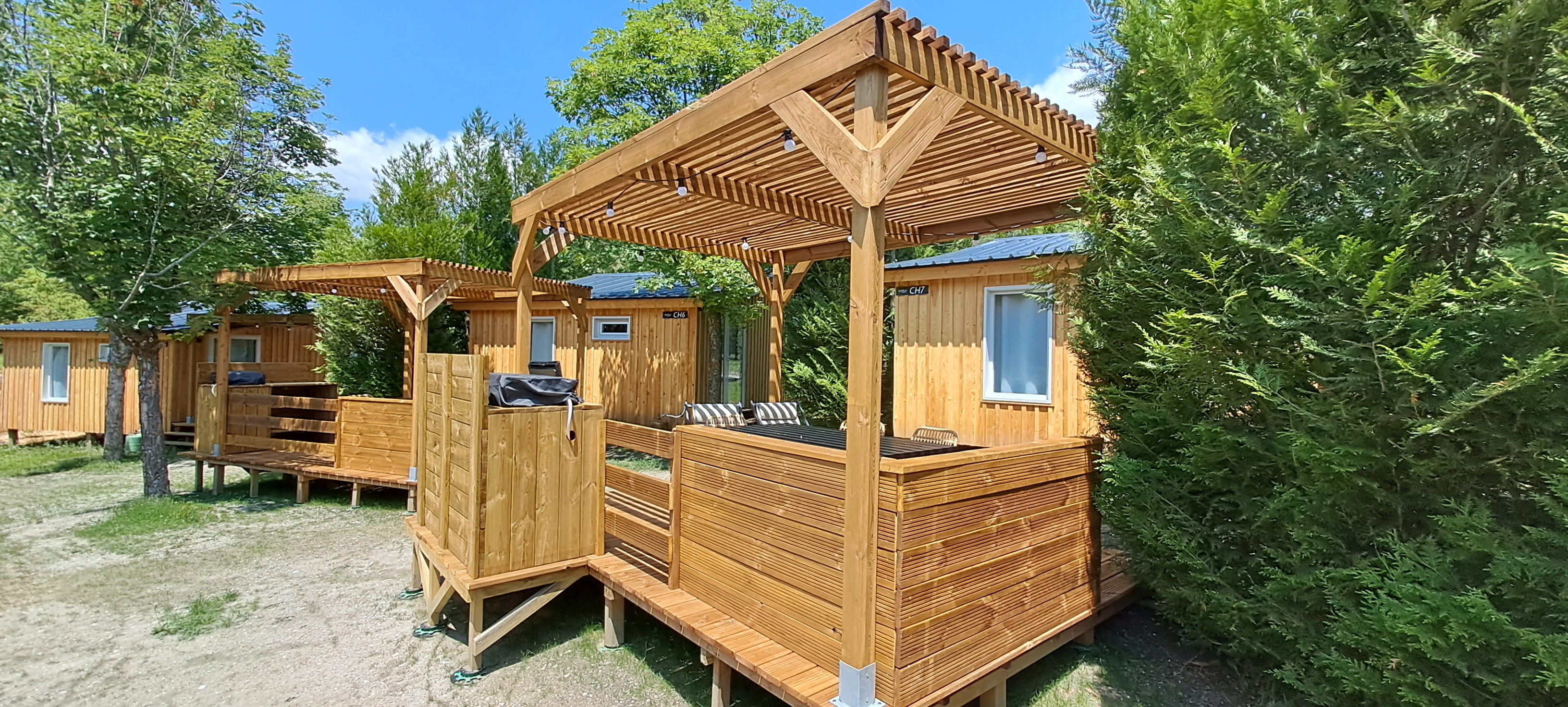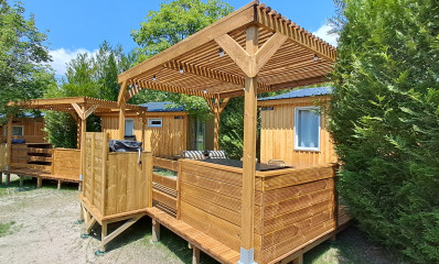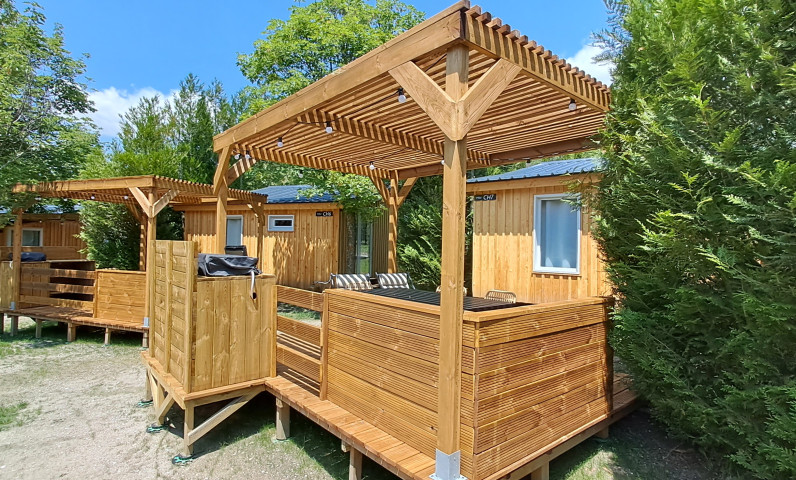 Genießen Sie dieses Prestige-Chalet in der Mitte des Campingplatzes, in einer Fußgängerzone.