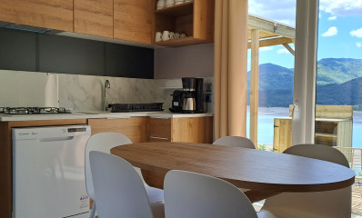 Das Sunêlia Luxe 6 Personen 33m2 Durchgang befindet sich am Ufer des Sees, gegenüber dem Grand Pic du Morgon oder der Kapelle St. Michel. Sie haben die Wahl zwischen einem sublimen Sonnenaufgang oder Sonnenuntergang. Mit einer größeren Terrasse können Sie nach einem erlebnisreichen Tag die Natur in vollen Zügen genießen. Und genießen Sie schöne Momente mit der Familie oder mit Freunden.