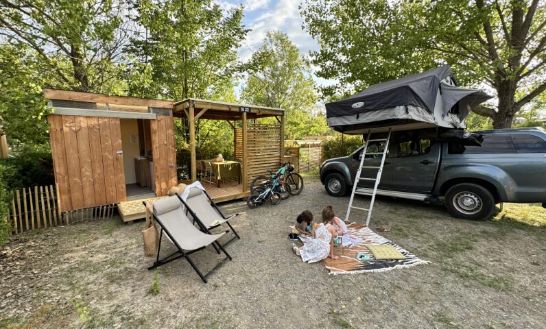 Entdecken Sie auch einen unserer 36 Stellplätze mit individuellen Sanitäranlagen auf einem Grundstück von fast 70 m 2-90 m 2. Die perfekte Verbindung zwischen den Freuden des Campings und dem Komfort des Alltags mit Ihrem individuellen Sanitärbereich von 6 m2 oder wenn Sie die Seele eines Abenteurers haben, entscheiden Sie sich für eines unserer Bivouac-Zelte.