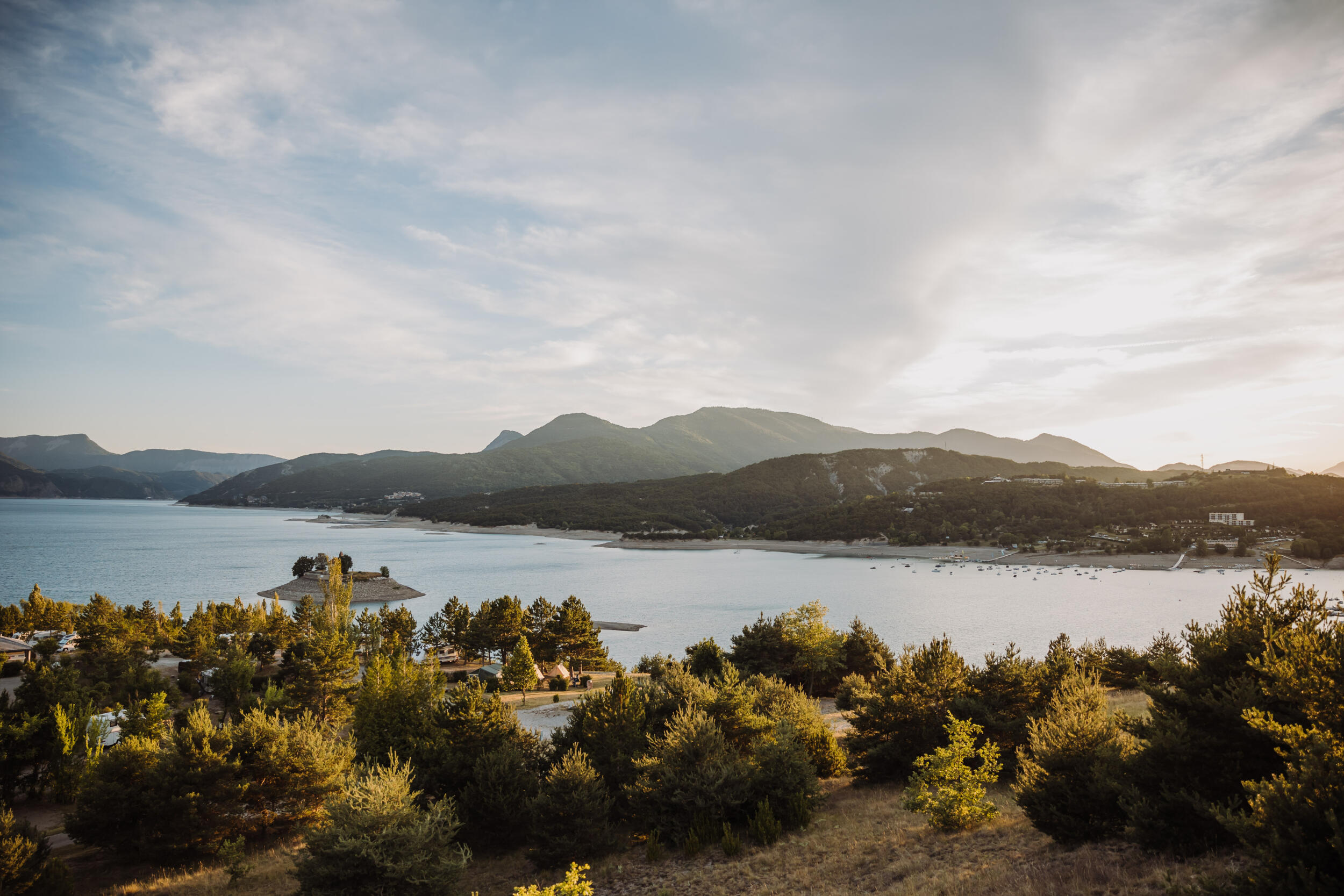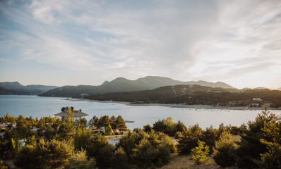 An einem einzigartigen Ort, zwischen See und Bergen, genießen Sie Ihren geräumigen Campingplatz von fast 120 m2 mit Zugang zu Wasser und Strom!