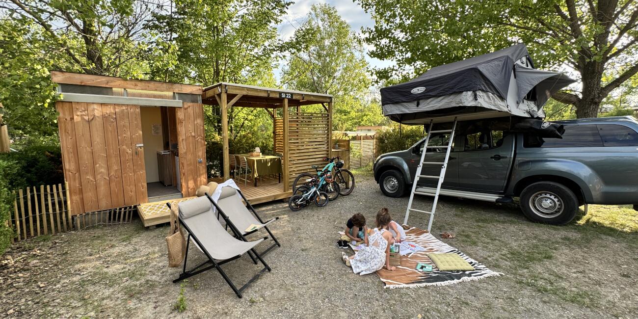 Entscheiden Sie sich für die perfekte Kombination aus Komfort und Abenteuer, indem Sie einen möblierten Stellplatz mit privaten Sanitäranlagen oder einem Biwakzelt wählen. Ideal für Camper, die auf der Suche nach einem authentischen Erlebnis sind, ohne dabei auf ihr Wohlbefinden verzichten zu müssen. Diese Optionen bieten eine praktische und intime Umgebung mitten in der Natur.