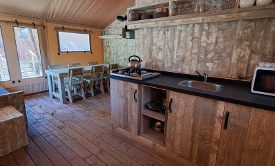 Der Campingplatz Sunêlia La Presqu'île bietet eine untypische und originelle Unterkunft: La Tente Wood Lodge.