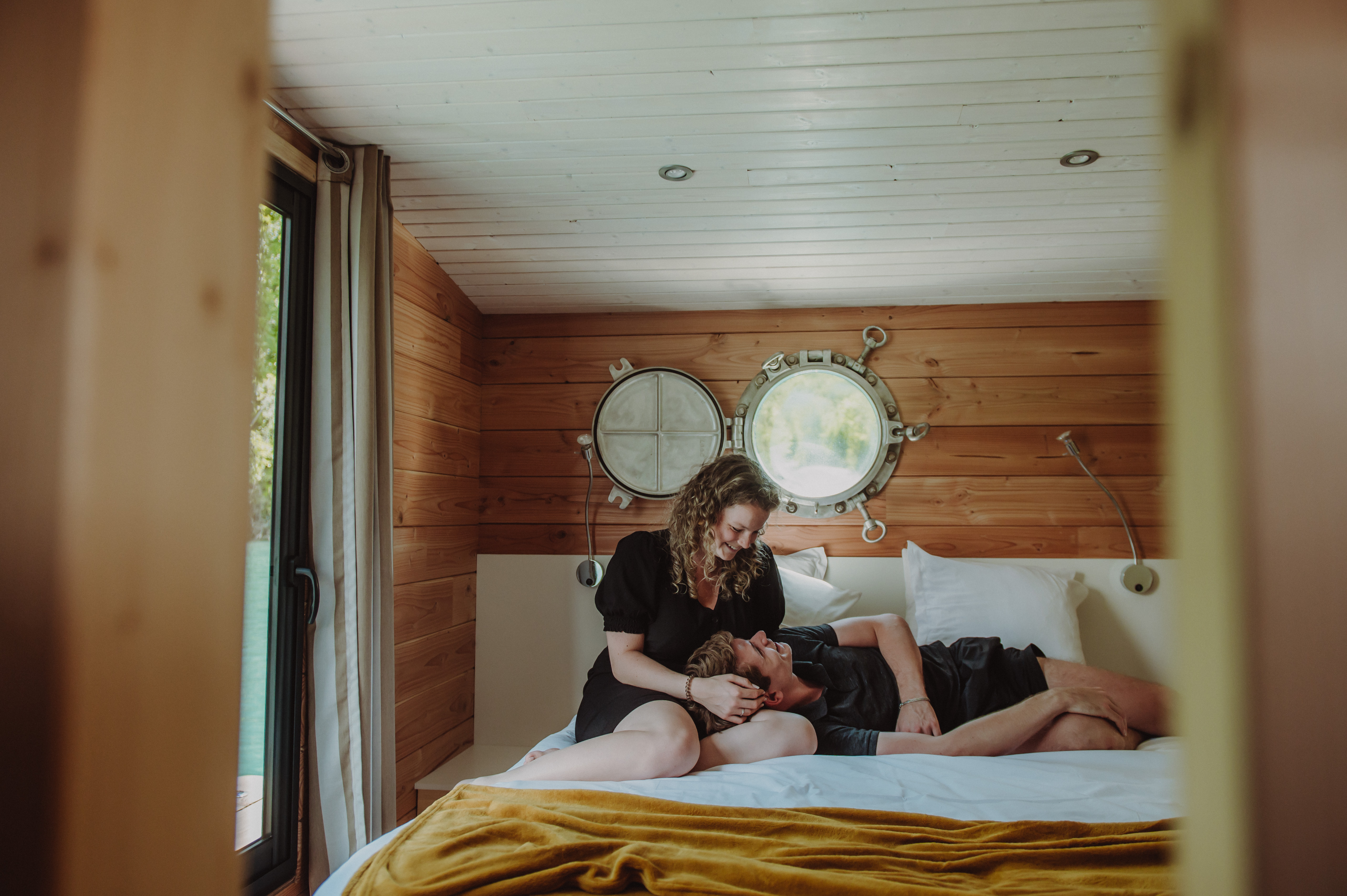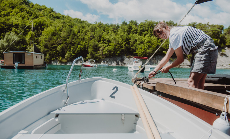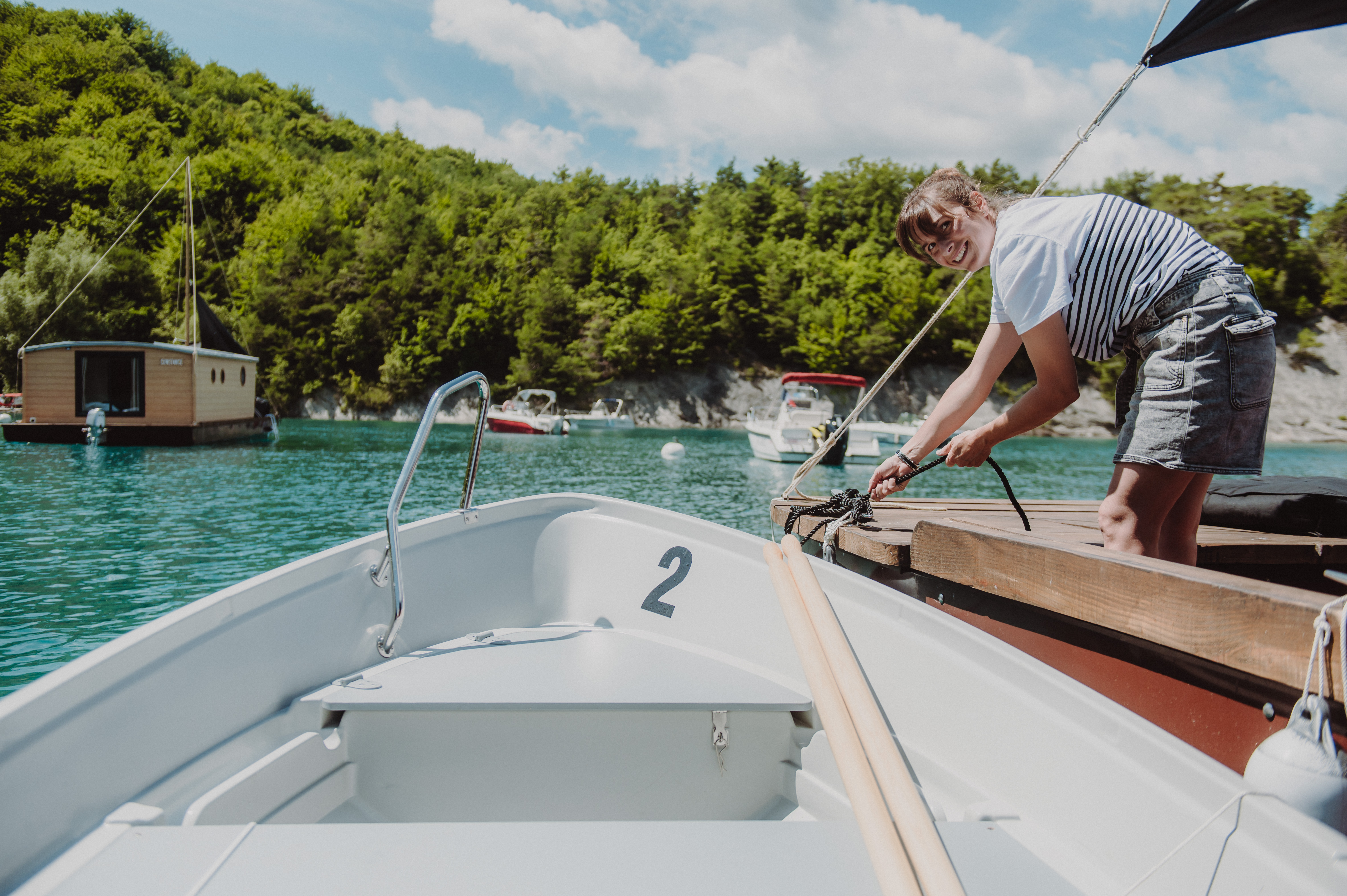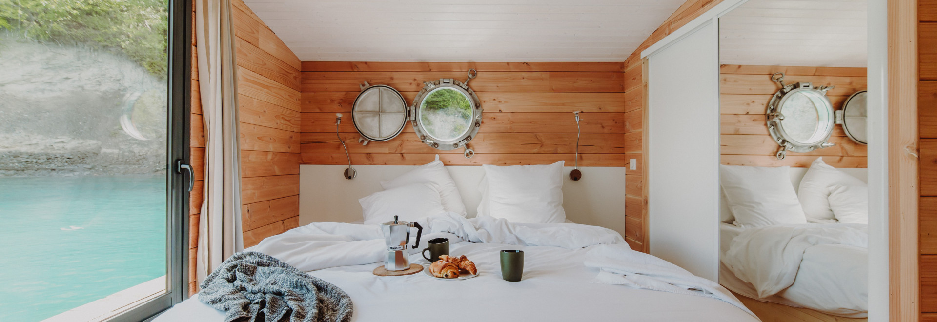 Beim Überqueren des Sees, gegenüber dem Campingplatz, entdecken Sie im Herzen einer geheimen Bucht eine familiäre Robinsonnade an Bord der Toues Cabanées, schwimmende Unterkünfte am Anlegeplatz im Herzen der Bucht von Foreston.