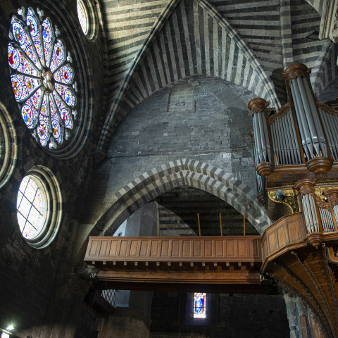 A voir à l'intérieur : Le maître autel du XVIII° siècle en marbre polychrome, les chaires à prêcher, les stalles du chœur, les autels baroques, les grandes orgues, la grande rosace du XV° siècle et ses trois oculi qui ornent la façade ouest.