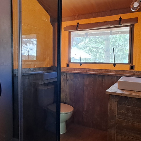 Tente Wood Prestige Plus : Cet hébergement de 38m² accueille de 4 à 5 personnes. Vous y retrouverez tout ce dont vous avez besoin pour concocter des repas aux couleurs estivales à partager en famille ou entre amis sur une large terrasse sur pilotis. - 1 Chambre avec 1 lit double 160x200 (2 lits simple 2x80x200) et une seconde chambre idéale pour les enfants avec 1 lit superposé 80x200 + 1 lit simple -1 SDB cabine de douche / WC - TV.