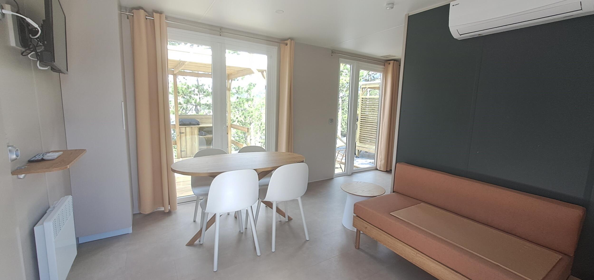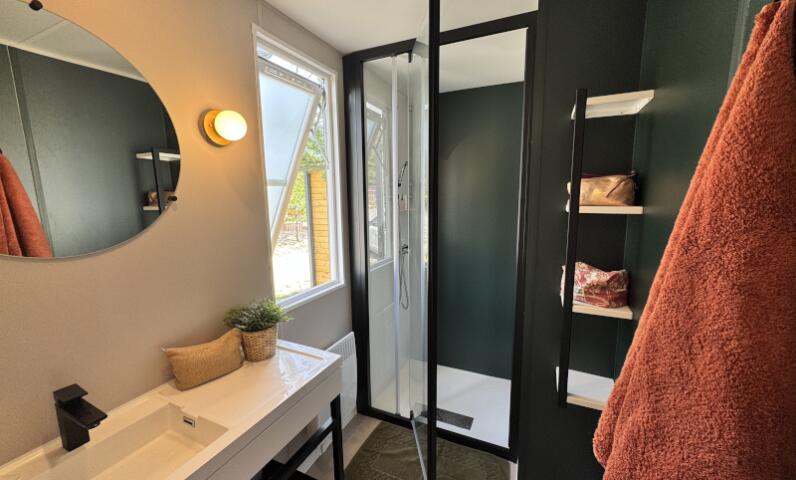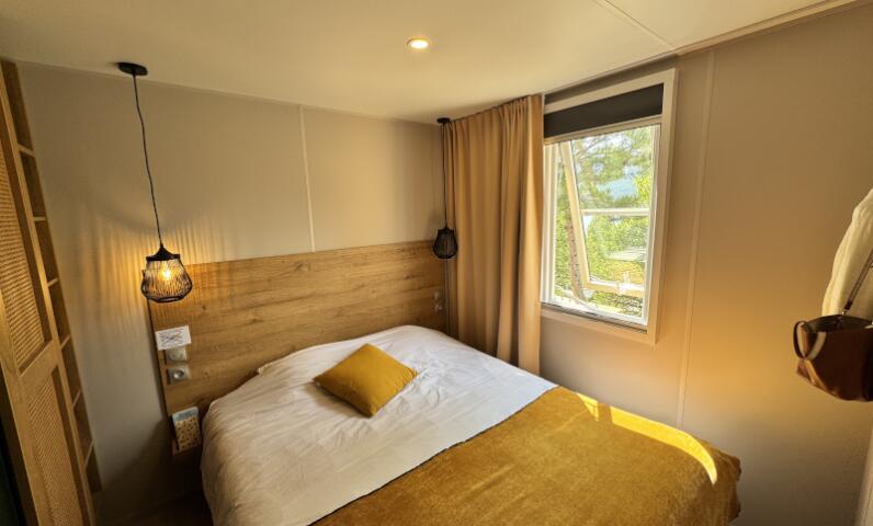 Avec une sublime vue sur le lac ou sur les montagnes environnantes, profitez d'une extension de terrasse, les pieds en éventail. Vous n'avez plus qu'à poser vos valises et profitez du luxe, des services et du confort qu'offre le Mobil-home Sunêlia Luxe traversant conçu pour 4 personnes...
