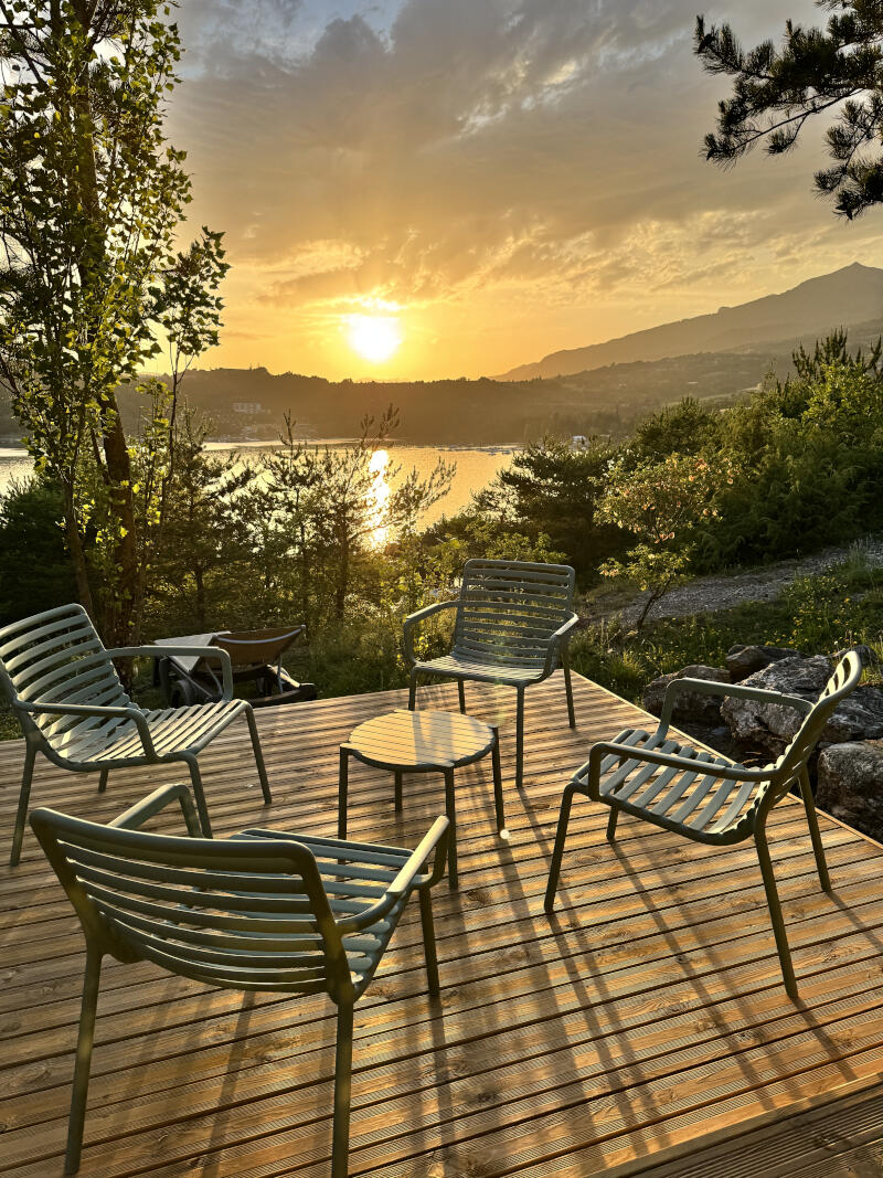 Ce Mobil-home dernière génération aux finitions réalisées avec finesse vous offre sa grande terrasse sur laquelle vous pourrez vous prélasser en toute tranquilité, après une journée riche en activités et en découvertes. Retrouvez un confort optimal grâce à des prestations haut de gamme incluses pour vous accorder une pause d'évasion et de relaxation au bord du fabuleux lac de Serre-Ponçon.