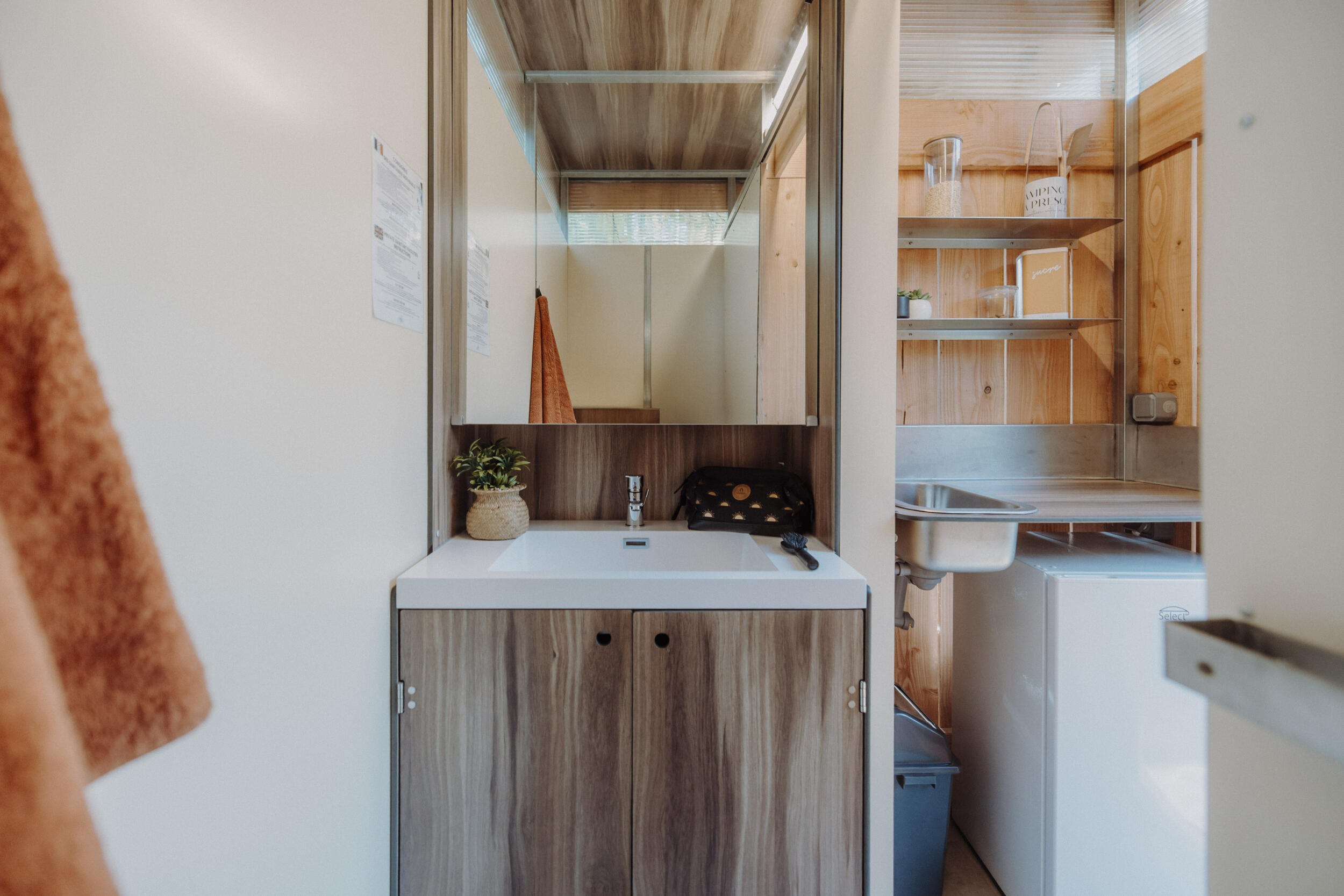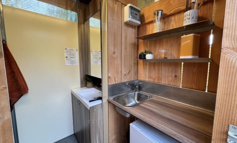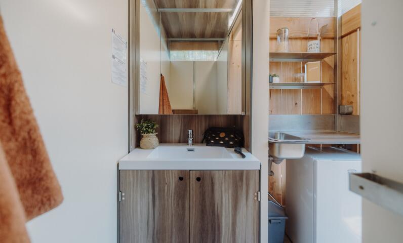 De perfecte combinatie van kampeerplezier en dagelijks comfort. Elke kampeerplaats is uitgerust met modern privésanitair, inclusief douche, toilet, wastafel en koelkast. Deze speciale ruimte garandeert u een onberispelijke hygiëne en totale privacy..