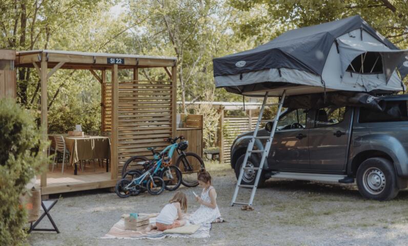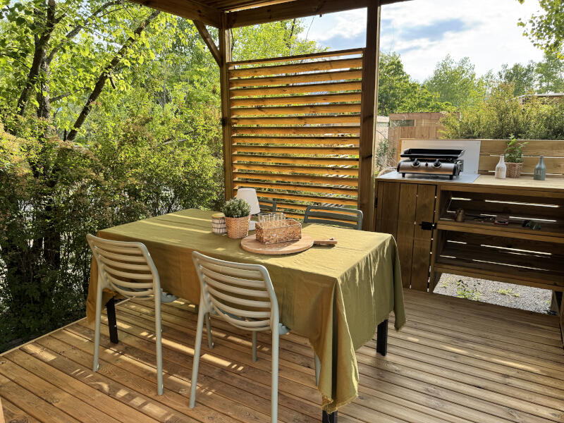 Om optimaal van het mooie weer te kunnen genieten, beschikken de kampeerplaatsen met luxe sanitair over een houten privéterras. Uitgerust met tuinmeubilair, plancha is dit de ideale plek om buiten te eten, een kopje koffie te drinken bij zonsopgang of te ontspannen met een goed boek aan het eind van de dag.
