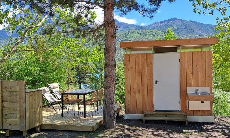 Kampeerplaats met privé sanitair en terras bij meer van Serre-Ponçon, een Hautes-Alpes
